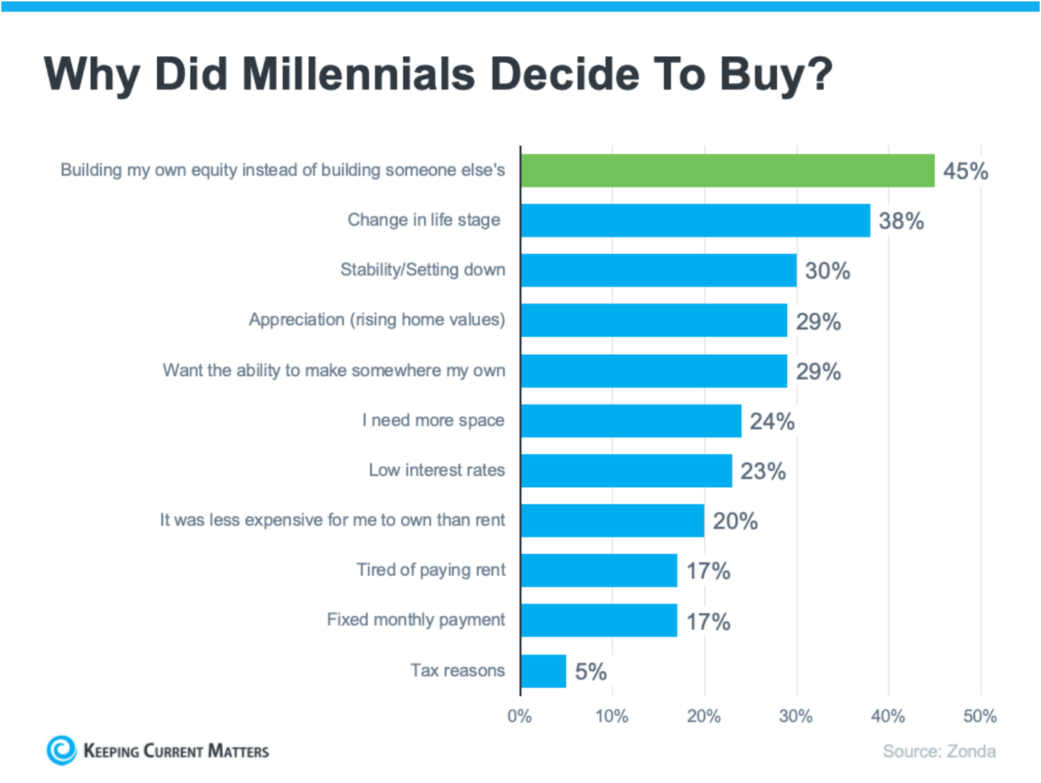 This graph shows why millennials are buying homes according to Zonda’s 6th annual millennial survey. The top reasons include building equity, a change in life stage, wanting stability, rising home values, and wanting to make somewhere truly their own. Here’s a look at each in more detail.