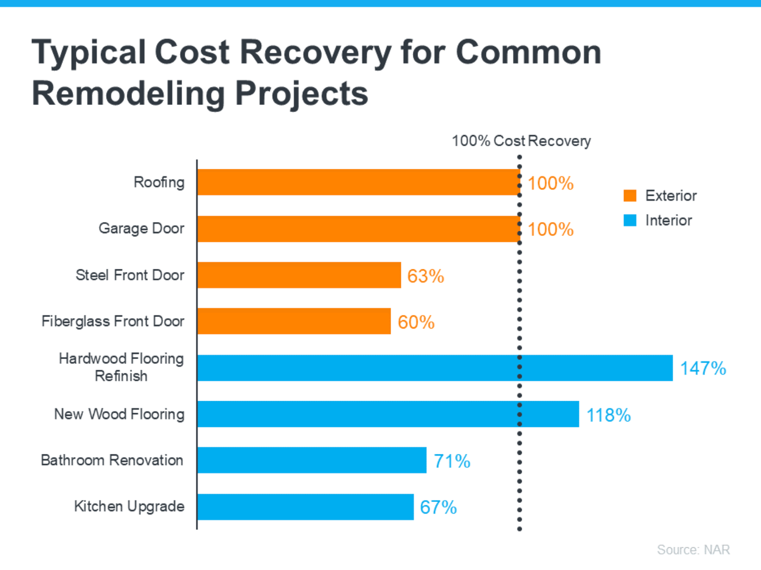 The 2022 Remodeling Impact Report from the National Association of Realtors (NAR) highlights popular home improvements and what sort of return they bring for the investment (see graph below):