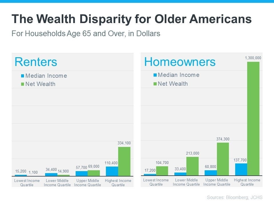 To help you understand just how much owning a home can have a positive impact on your life over the years, take a look at what the data shows. The same Bloomberg article helps show the gap in wealth between renters and homeowners who are 65 years and older (see graph below). The difference is substantial, even when incomes are similar.