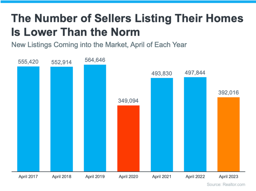 Looking back at every April since 2017, the only year when fewer sellers listed their homes was in April 2020, when the pandemic hit and stalled the housing market (shown in red in the graph below). In more typical years, roughly 500,000 sellers add their homes to the market in April. This year, we saw fewer than 400,000 sellers entering the market in April (see graph below):